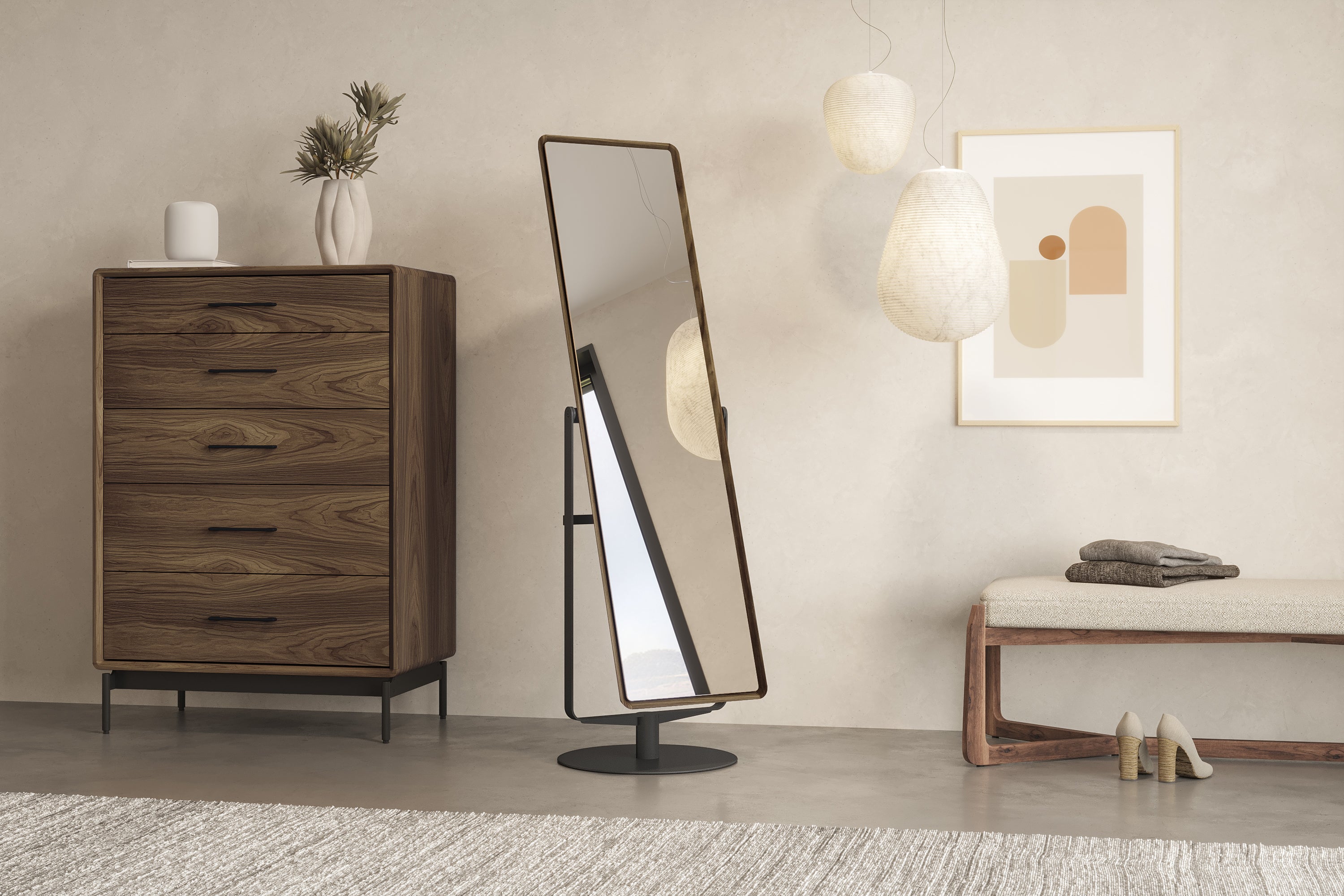 The Continuum Cheval Mirror is a modern take on a classic full-length standing mirror, offering both style and function in one elegant design. Featuring a substantial beveled wood frame, the mirror appears to float within, creating a refined visual effect. Its smooth tilt mechanism and 360° swivel base allow you to adjust the angle effortlessly, ensuring a perfect head-to-toe view every time. With its sleek silhouette and adjustable features, Continuum is a stunning and practical addition to any bedroom, dressing area, or entryway.