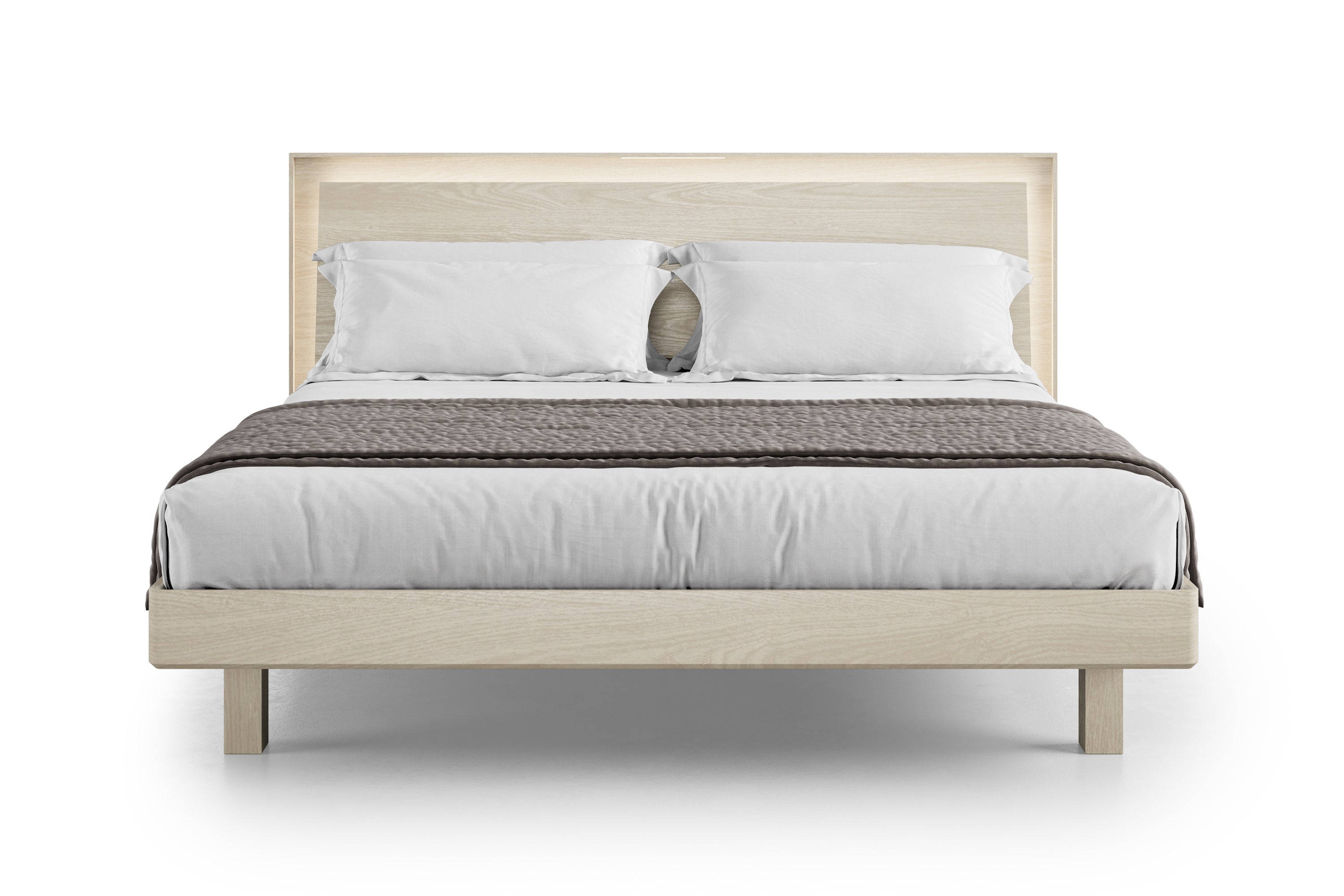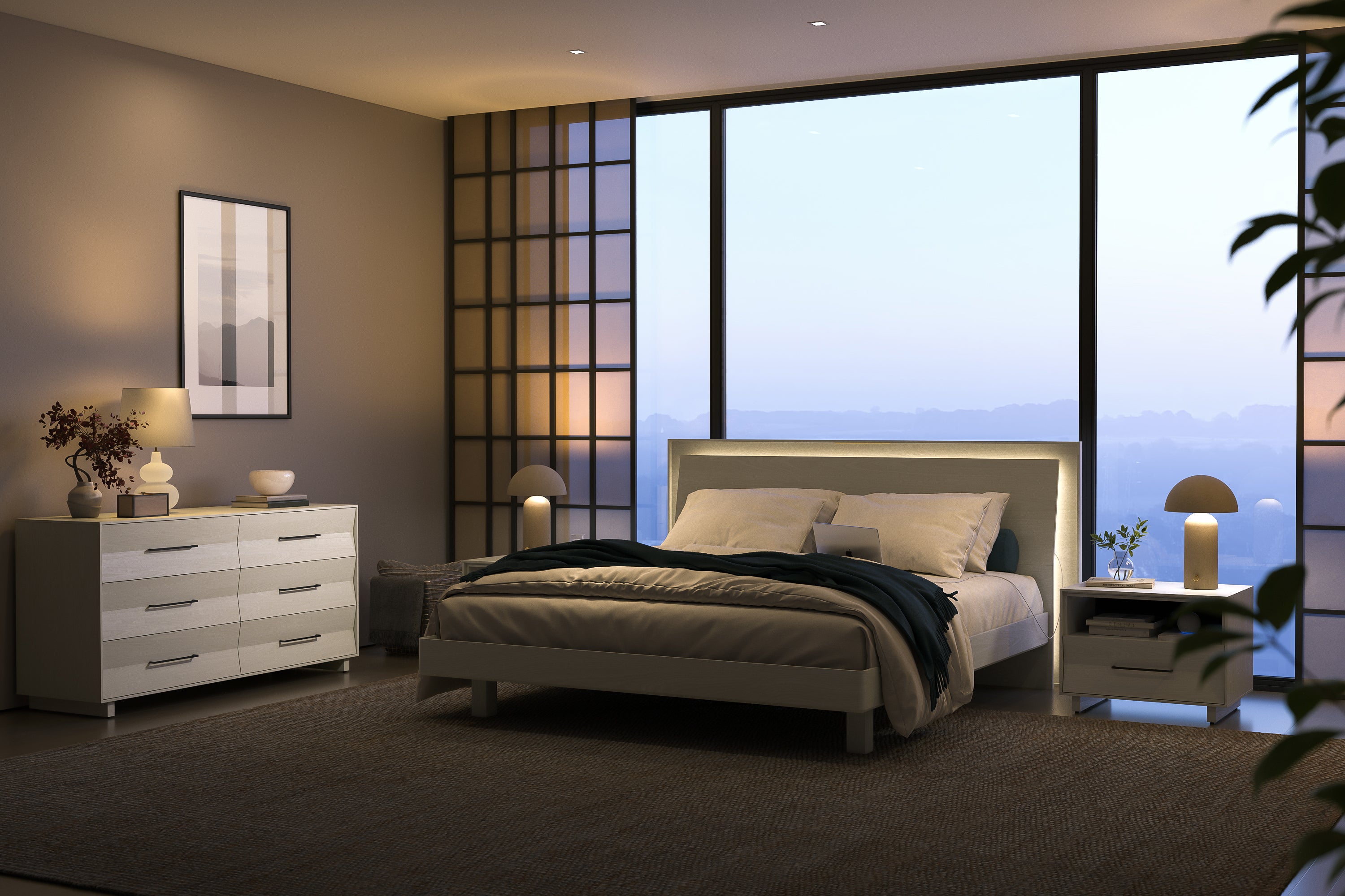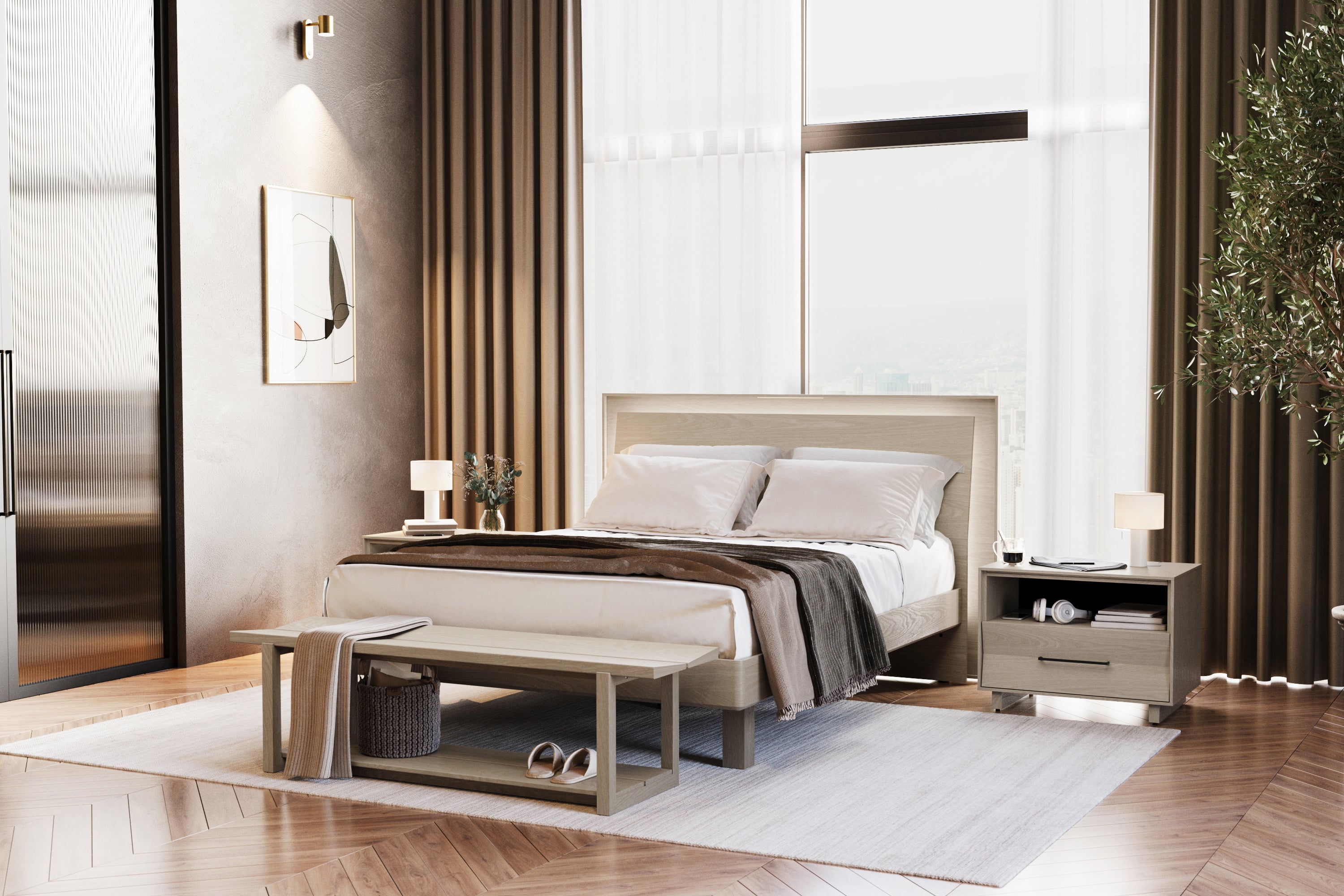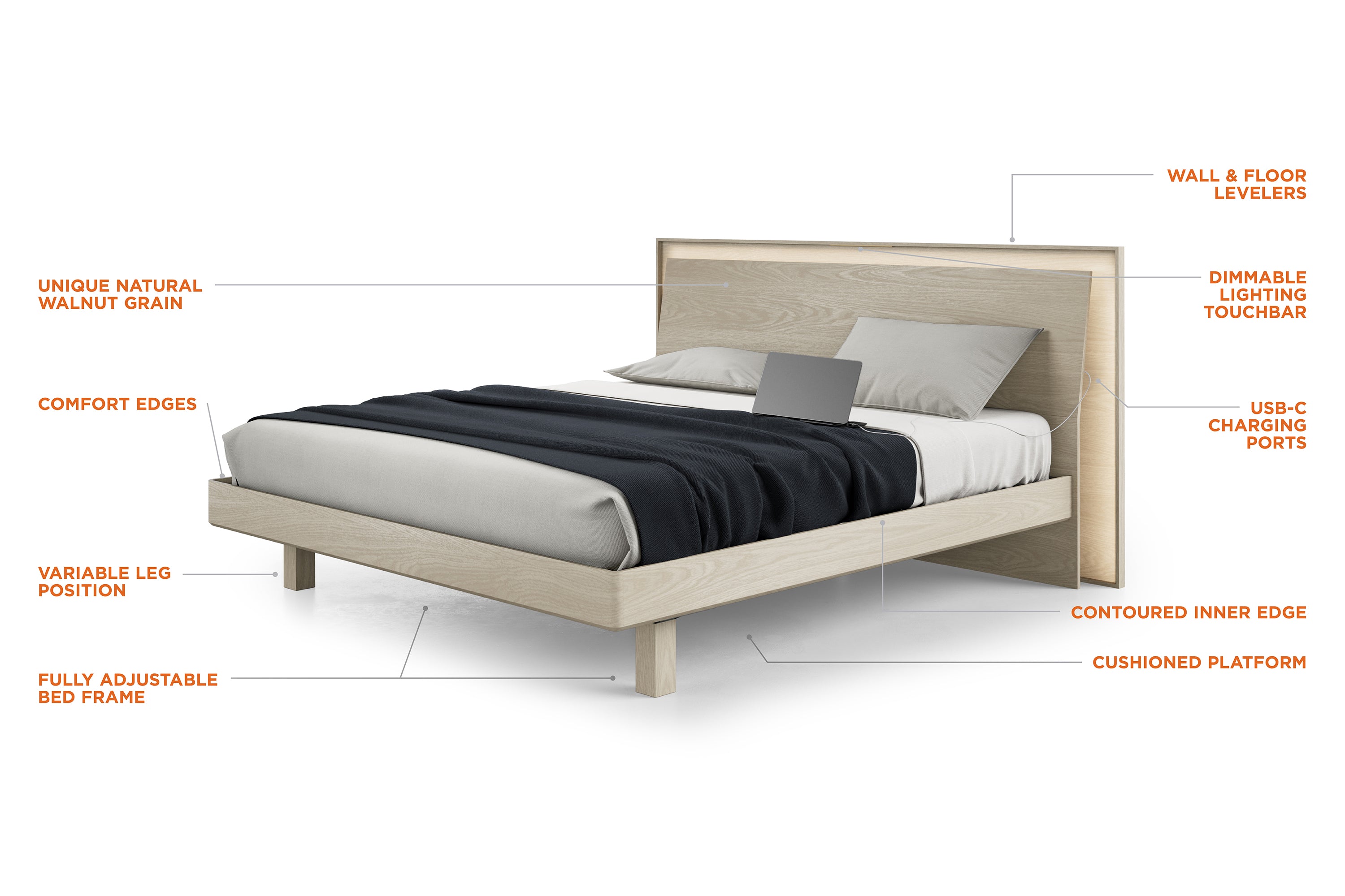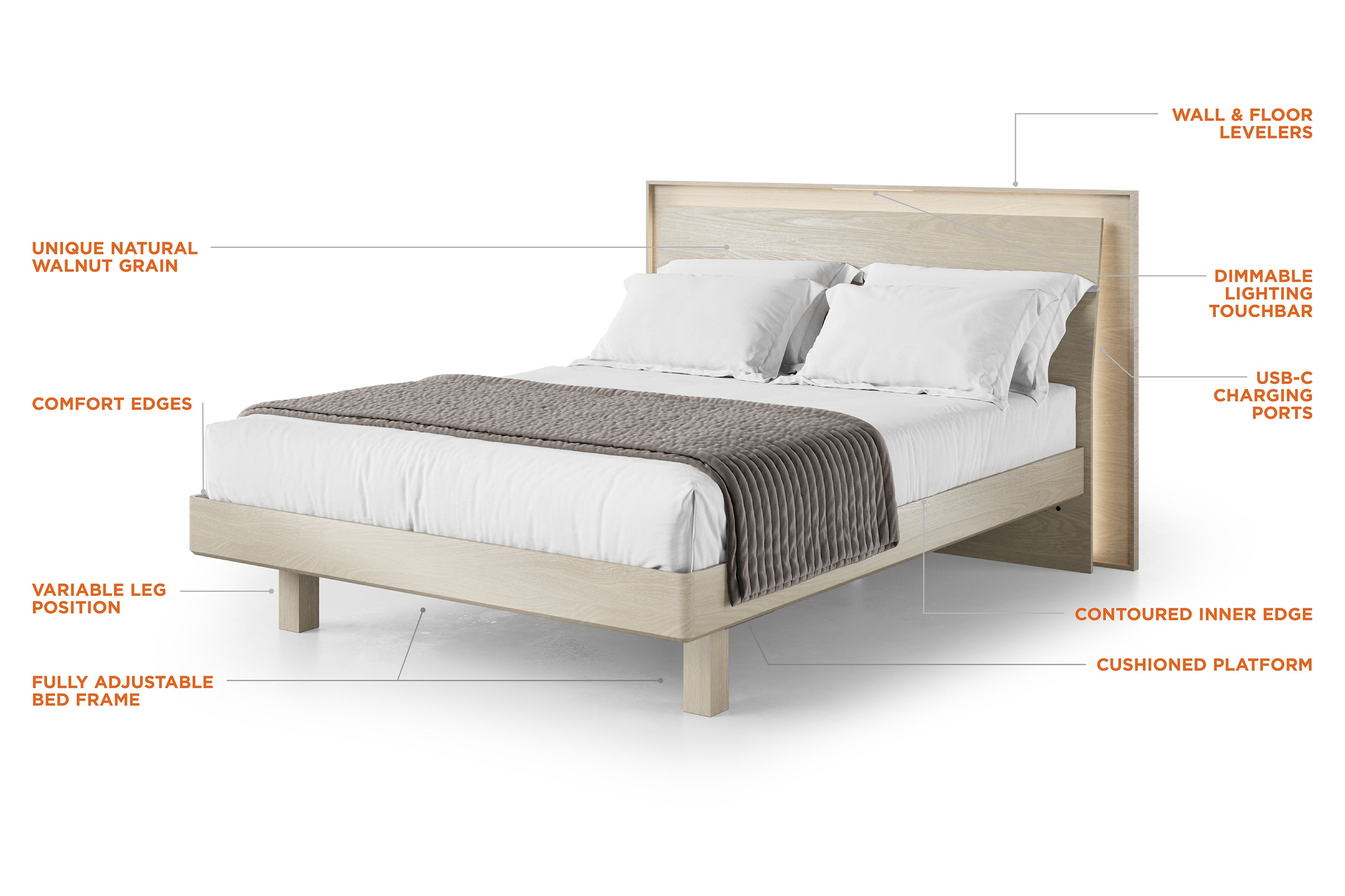 The KAVA Walnut Bed is a bold statement piece that combines architectural elegance with modern functionality. Its geometric floating-panel headboard adds sculptural appeal, while built-in dimmable lighting lets you set the mood with ease. Dual USB-C charging ports keep your devices powered and close at hand, and the adjustable-height frame fits a variety of mattress types. Thoughtfully designed fabric-wrapped slats enhance airflow and support for a quiet, restful night’s sleep.
