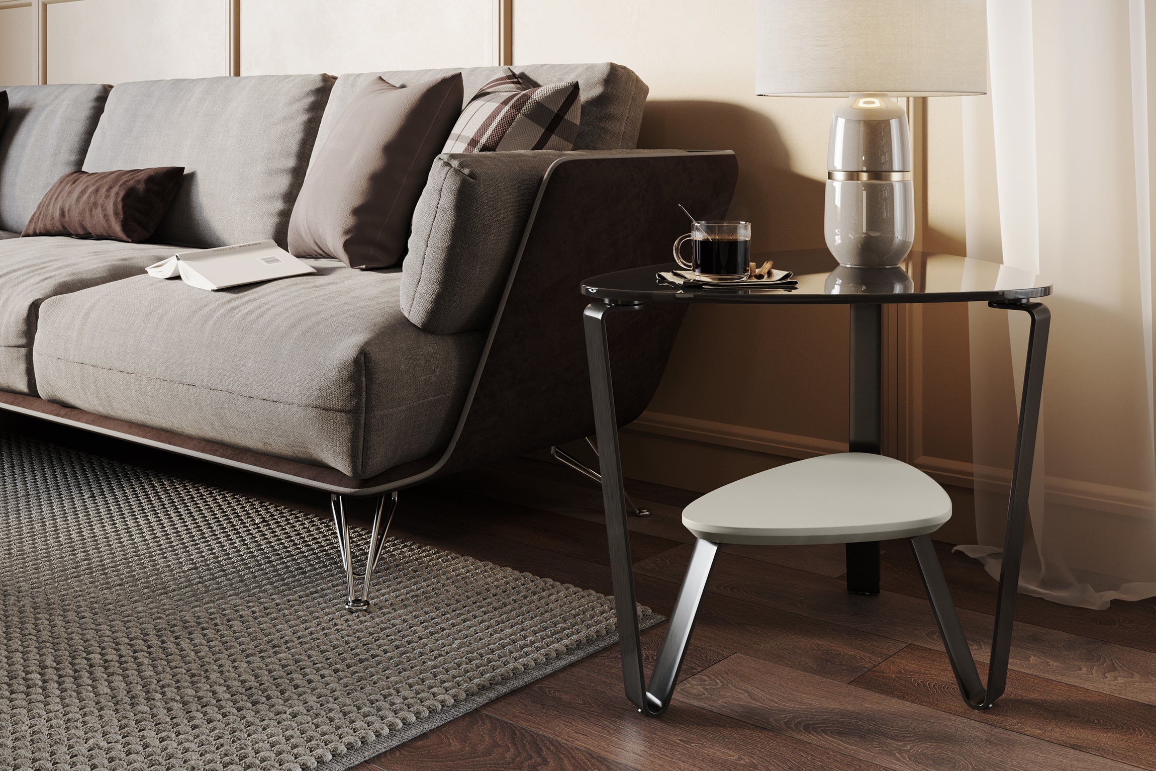 The uniquely-shaped Dino table collection has been updated with brushed carbon legs, grey-tinted glass, and a new finish assortment. The sleek and sophisticated design makes it an excellent choice for sectional sofas and spaces where a rectilinear table isn't the answer.