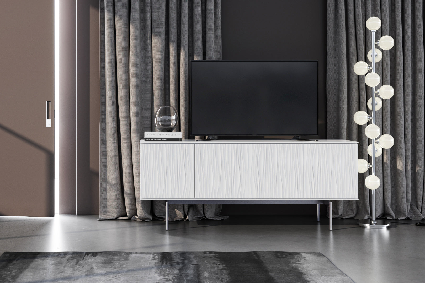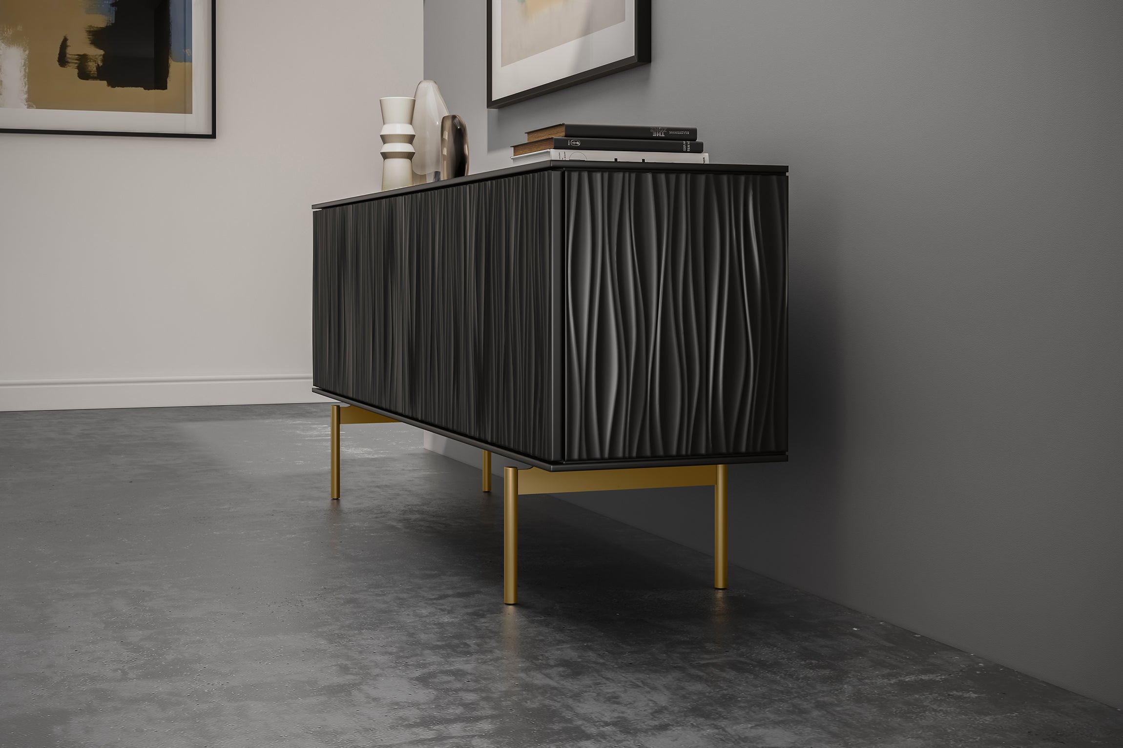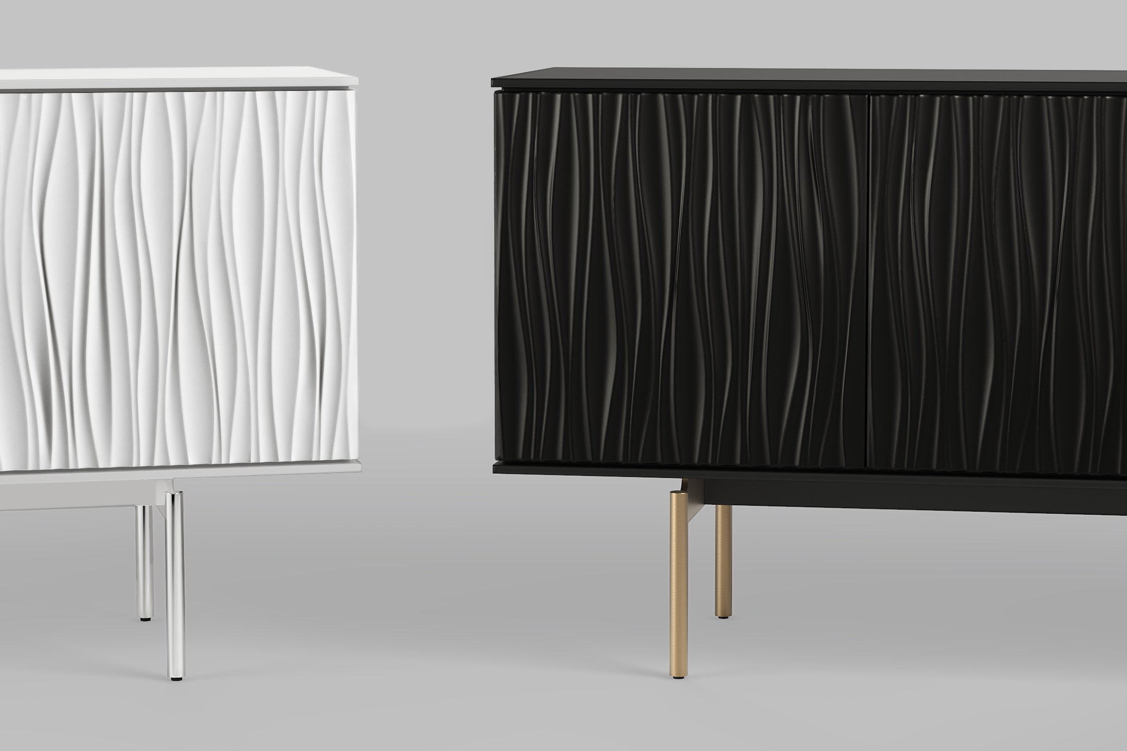 The Tanami is an undeniable show stopper! Beautifully sculpted patterns flowing and waving vertically creates a soothing mood and gently manifest as the focal point in any room. Use it for storage or as a media console with adjustable shelving and built-in wire management. This Quick-Ship Credenza can be customized in two finishes.