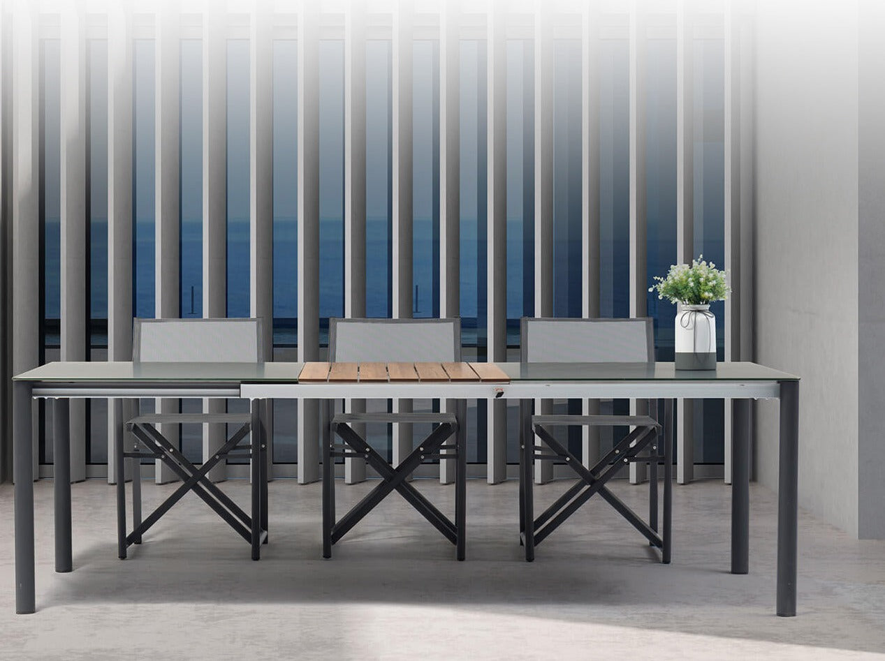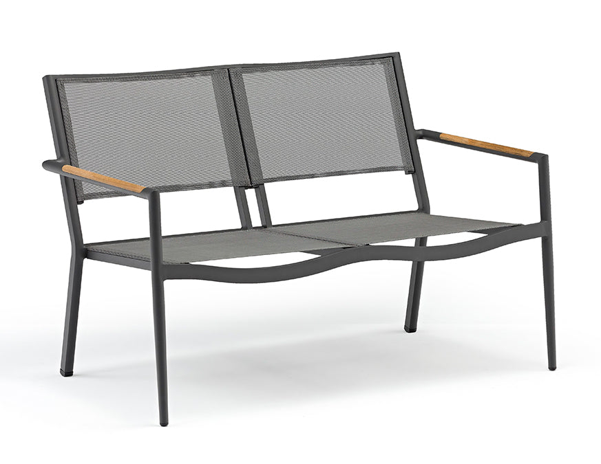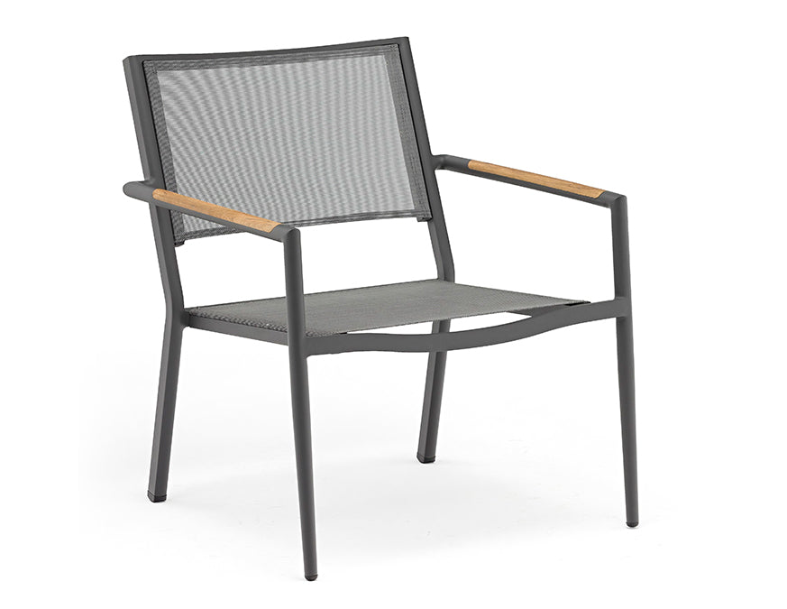 The Polo outdoor furniture set is great for outside residential or commercial seating. Elegant framing is accented by subtle teak inlays and the aluminum frame is powder coated in a medium grey UV protected finish. Complete the entire outdoor environment from dining tables and chairs to poolside lounging.