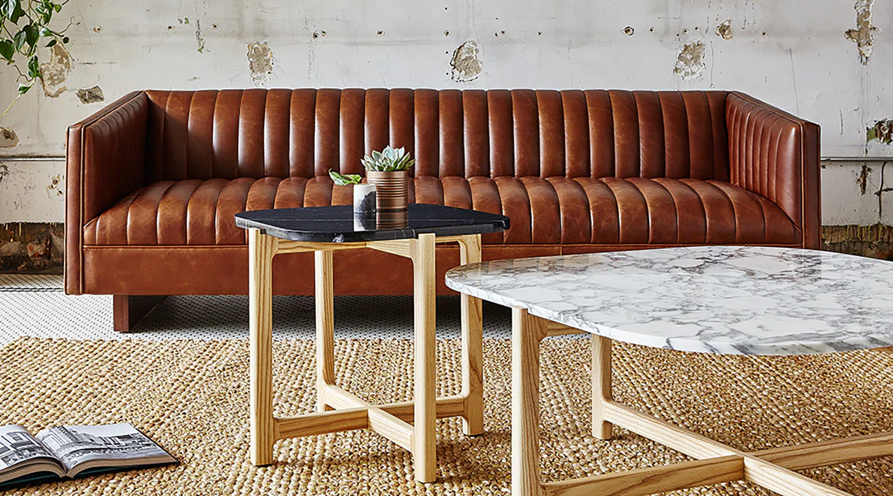 The Wallace Sofa is a modern reinterpretation of the classic English Chesterfield design. The channel-stitched leather upholstery on the seat, back, and arms creates a surface that is both visually striking and remarkably comfortable. Piping details, sloping armrests and an angular wooden base add sculptural, contemporary flair, while luxurious channeled padding make it perfect for lounging. Available in three vintage leathers, chosen for their unique grain characteristics that will age beautifully and develop a rich natural patina over time. Matches perfectly with the Wallace Chair.