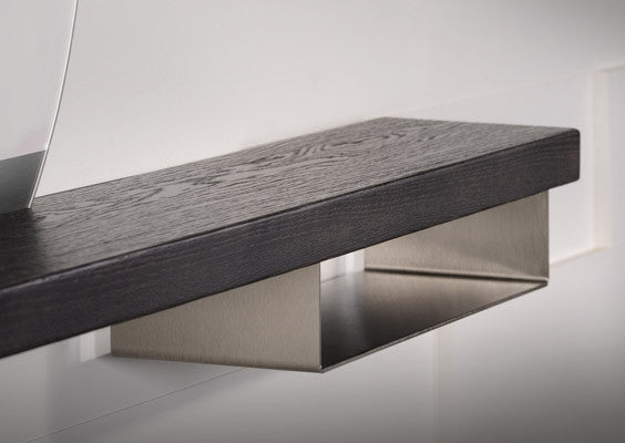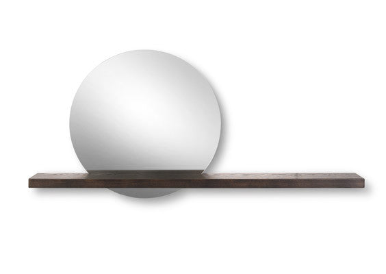 The contemporary Halo mirror by Trica Furniture is custom made in Canada with a balanced combination of metal and wood. The round mirror can be made on the left or right.