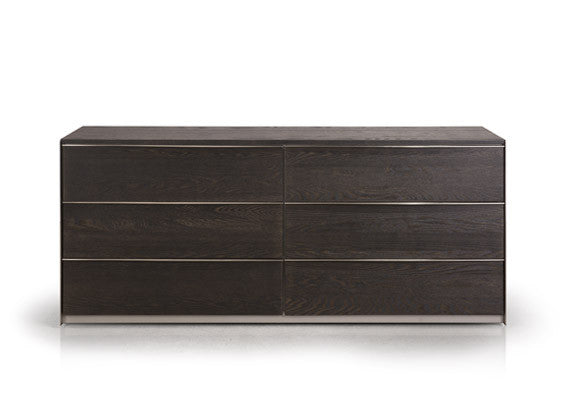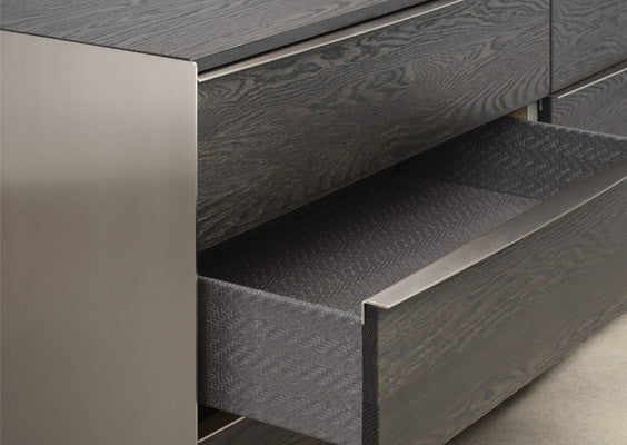 The Roots bedroom collection is made of solid oak with metal accents on the sides and drawer handles. Luxury hides inside the upholstery lined drawers which are completely customized to fit your style. The Roots Bedroom Storage is made to order by Trica Furniture with 6 variations of wood finishes, a dozen different powder-coated metal options and a plethora of fabric choices for the inside of the drawers.