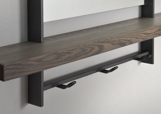 The contemporary Matuvu mirror by Trica Furniture is custom made in Canada with a balanced combination of metal and wood. The rectangular mirror is positioned directly above the wooden shelf with an optional coat rack under the shelf.