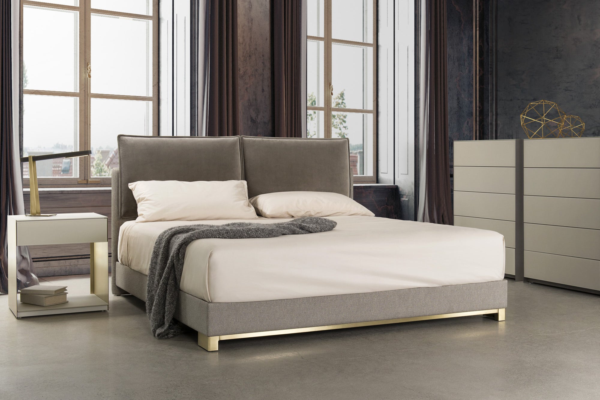 The all upholstered Nest bed has a sleek minimalist design with an easy way to add some unique accents to your bedroom design. For example, get the extended upholstered backdrop for the headboard and add a custom colored metal shelf. The Nest bed comes with two headboard pillows included that can be adjusted to three different heights: 45 1/2”, 48 1/2” and 51 1/2”.