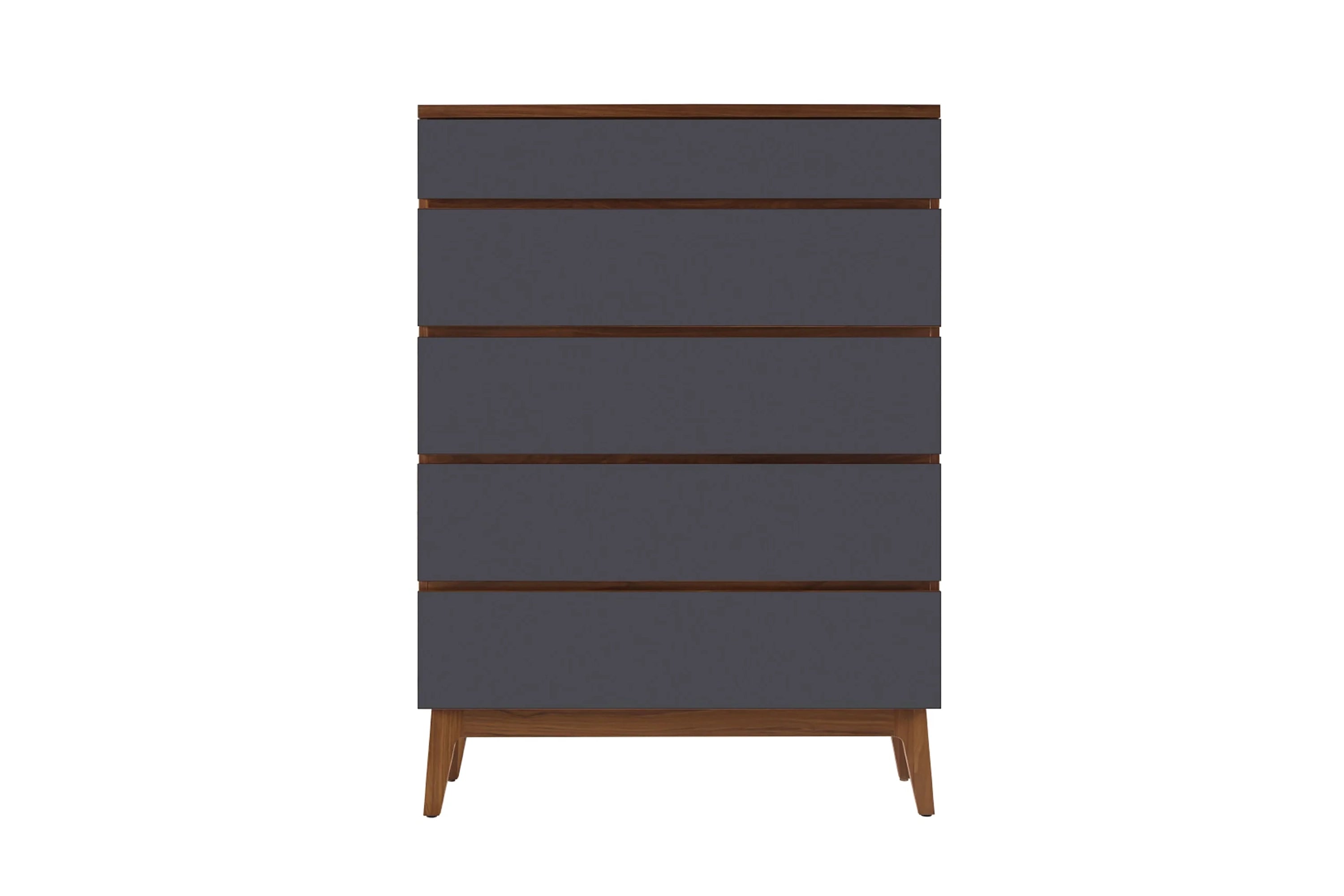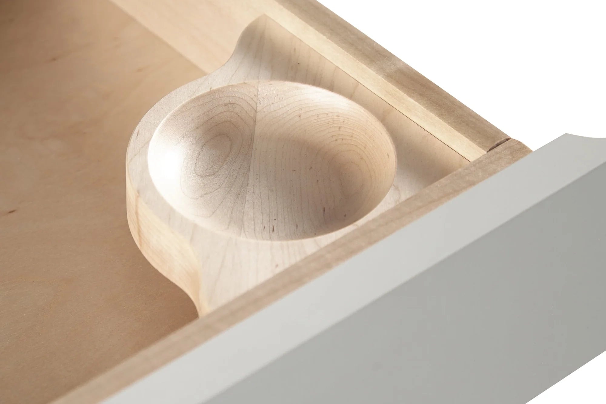 Designed for everyday ease, the Serra Chest features five soft-close drawers for smooth, quiet operation, along with an integrated coin tray to keep jewelry and small essentials organized. For a more contemporary look, drawer fronts can be customized with optional accent colors in Mist or Slate, adding subtle contrast and a tailored design detail. Its vertical profile offers generous storage while maintaining a streamlined footprint.
