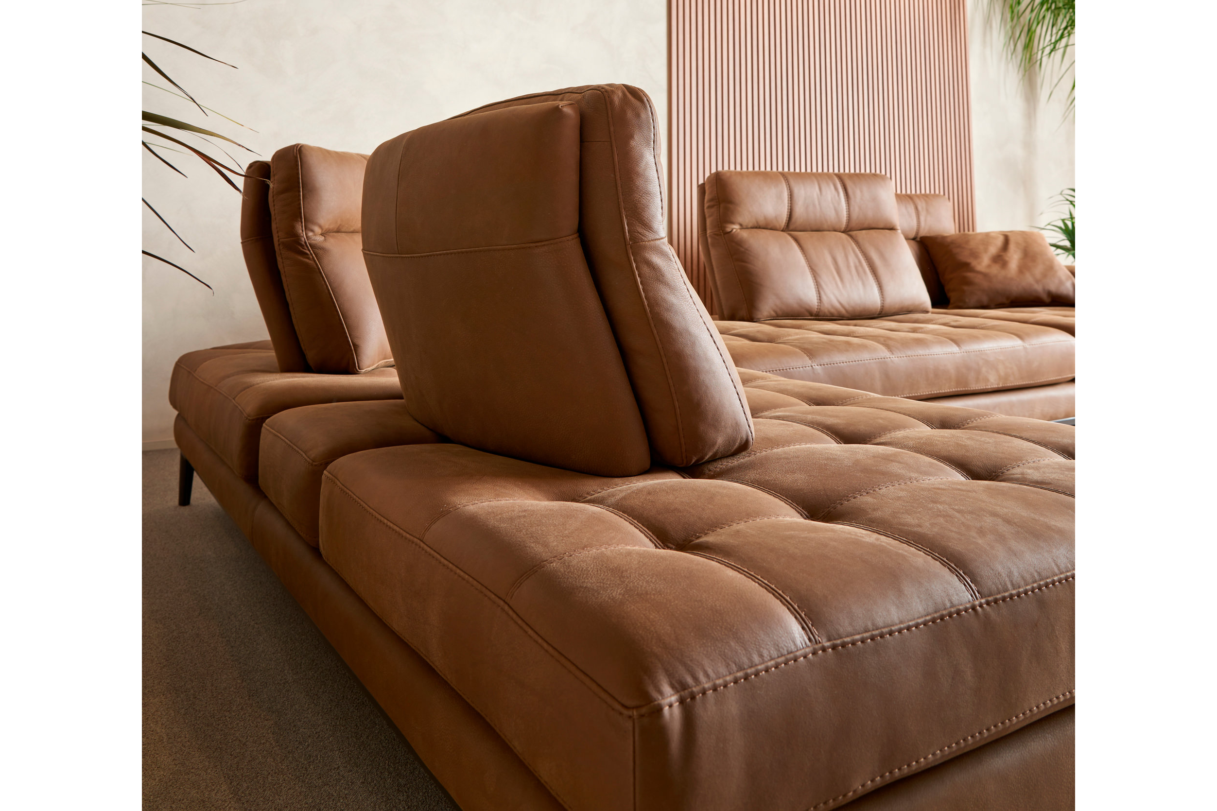 The HOLLYWOOD Italian Leather Sectional embodies understated elegance and refined craftsmanship. Defined by its clean lines and sculptural presence, this sofa features a square armrest with bold proportions and handcrafted geometric quilting that adds subtle texture and depth.